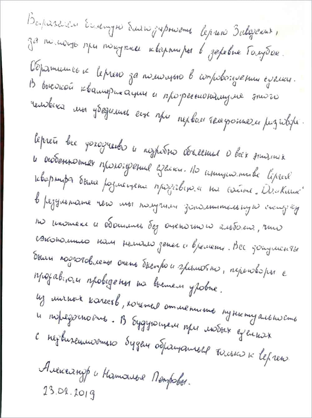 Отзыв Сергею Заводских от Александра и Натальи о покупке квартиры
