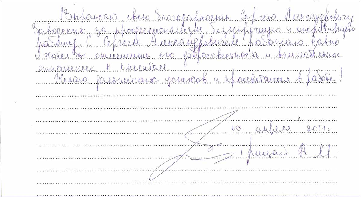Выражаю свою благодарность Сергею Александровичу Заводских за профессионализм, безупречную и оперативную работу. С Сергеем Александровичем работаю давно и хотел бы отметить его добросовестность и внимательное отношение к клиентам. Желаю дальнейших успехов и процветания в работе!" 10 апреля 2014 года.