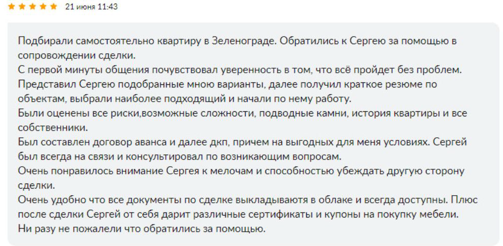 Отзыв Сергею Заводских от Олега Н. о сопровождении сделки покупки квартиры в Зеленограде