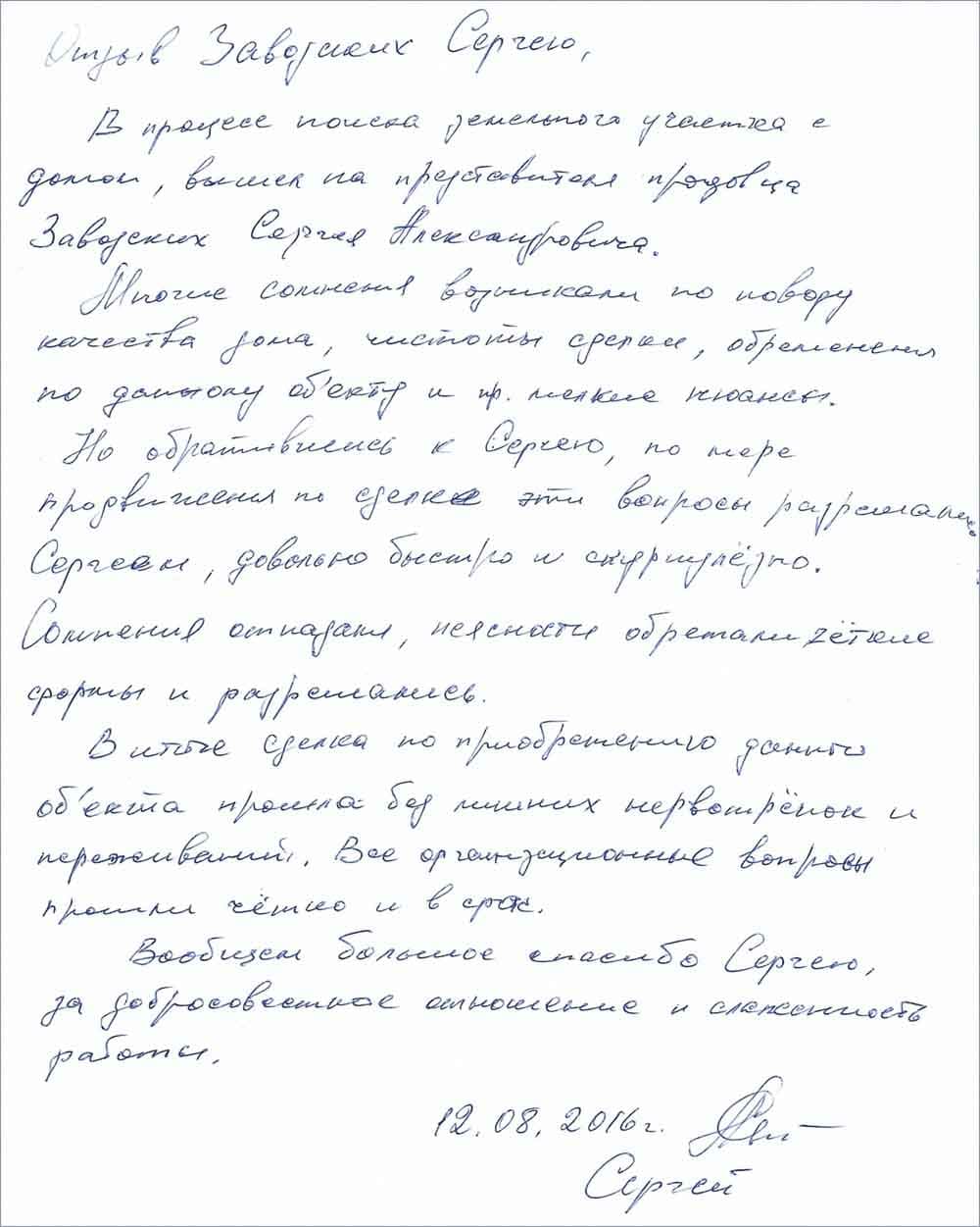 Отзыв о Сергее Заводских по сопровождению покупки загородного дома от Сергея К.