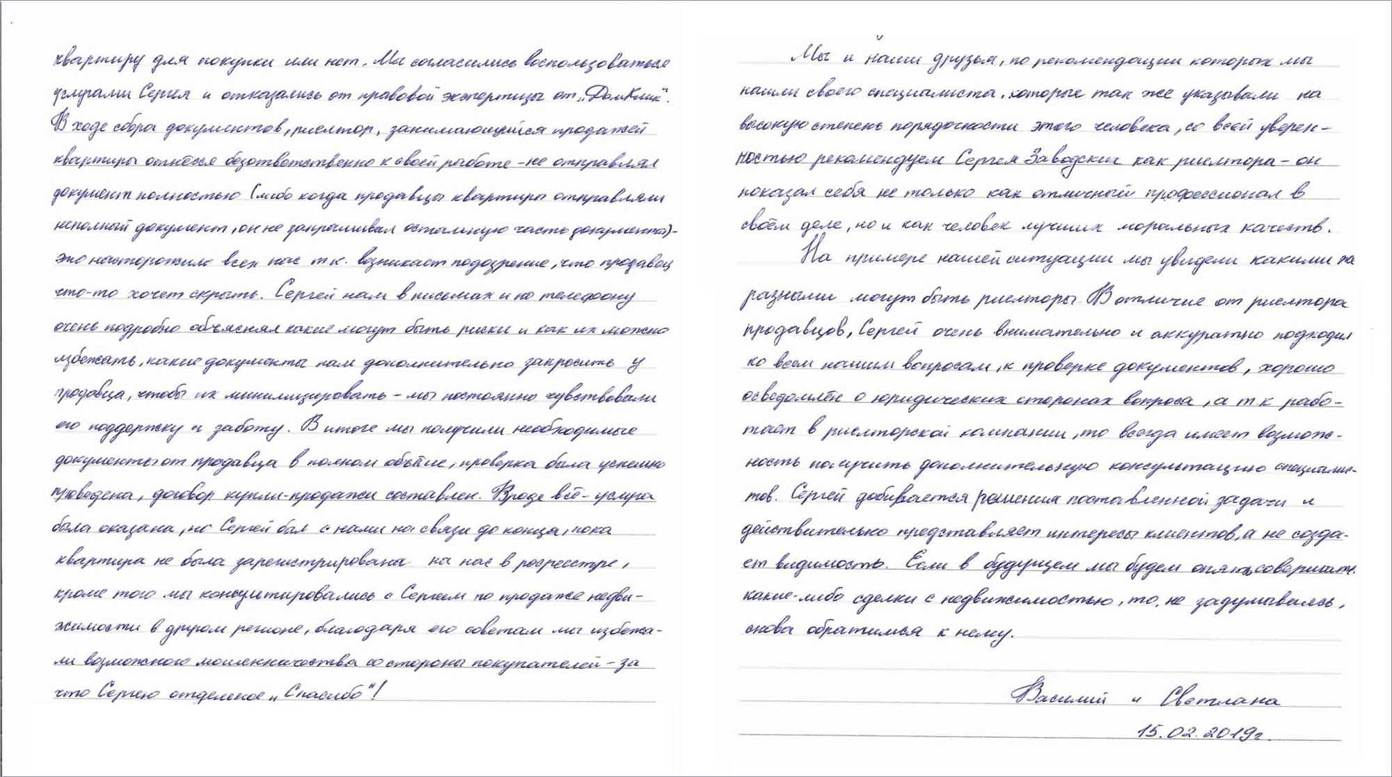 Отзыв Сергею Заводских от Василия и Светланы об удаленном сопровождении покупки квартиры