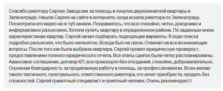 Отзыв Сергею Заводских от Татьяны о покупке квартиры в Зеленограде