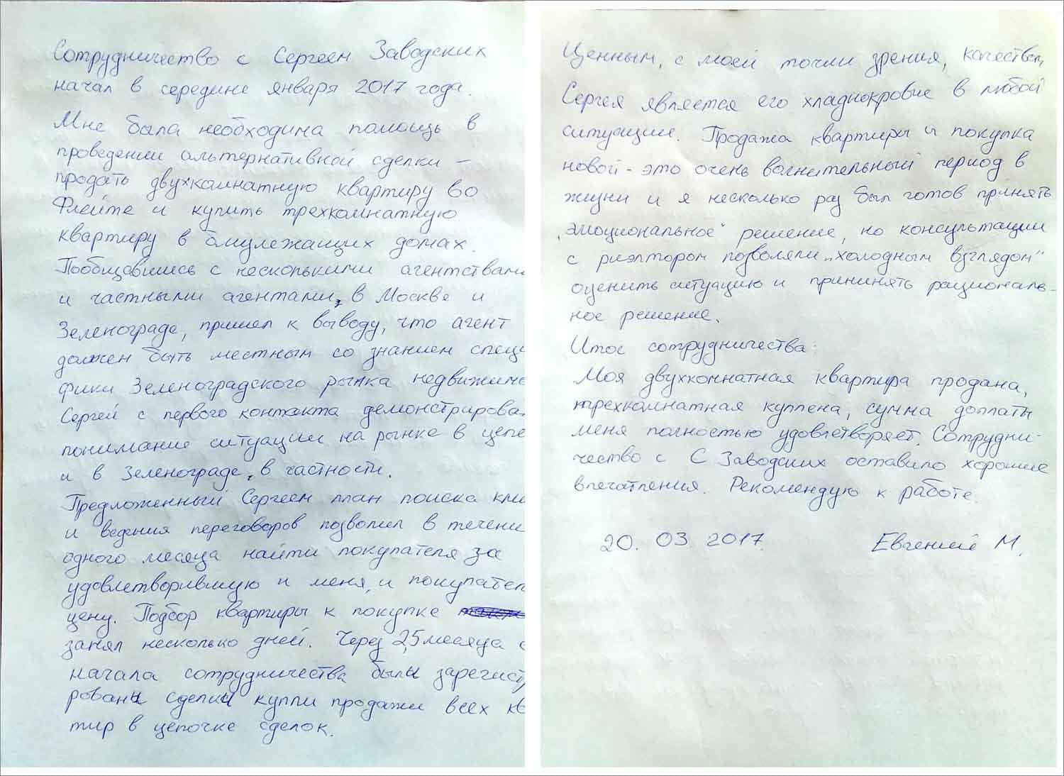 Отзыв Сергею Заводских от Евгения М. об одновременной продаже и покупке квартиры в Зеленограде